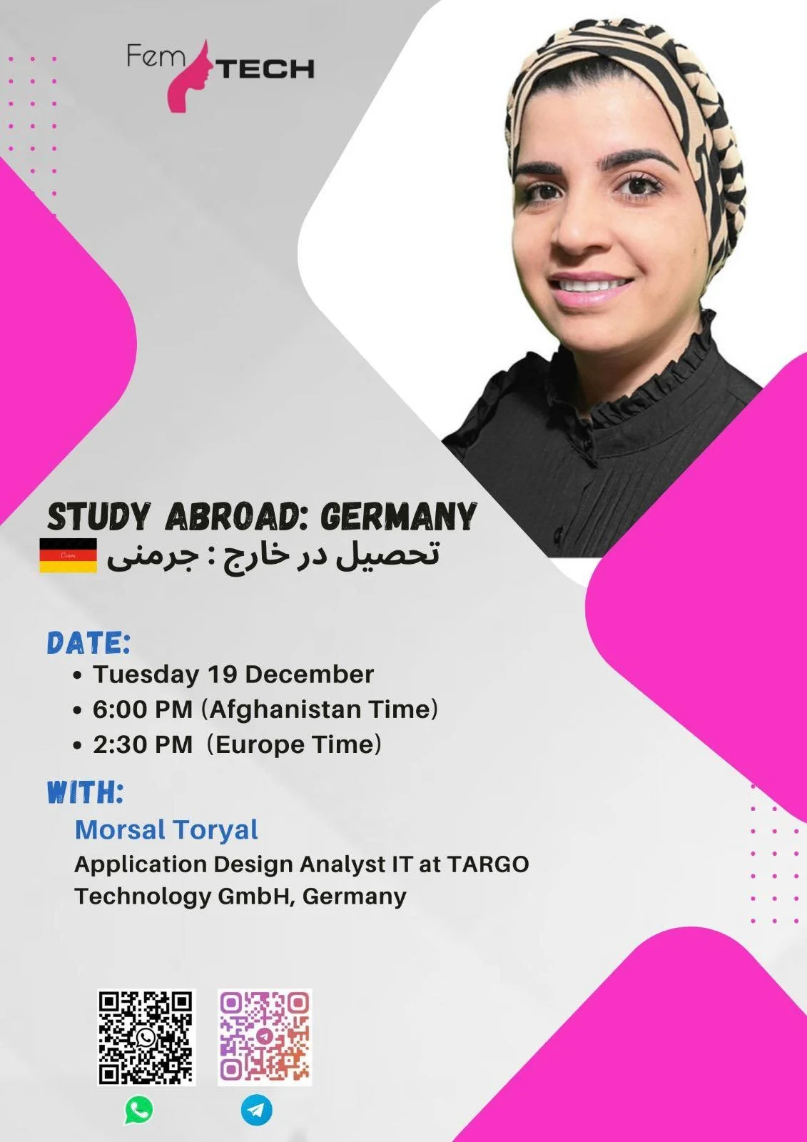 We are pleased to share a detailed report on our recent Study Abroad Presentation, focusing on educational opportunities in Germany. The event took place on December 19, 2023, during one session: from 2:30 PM to 4:15 PM CET and 6:00 PM to 7:45 PM Afghanistan Time.